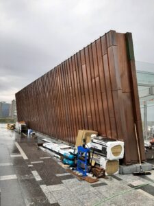 Reclaimed copper arrived in varied lengths and conditions. The design intent required a composed visual rhythm while minimizing waste and maintaining weather integrity.